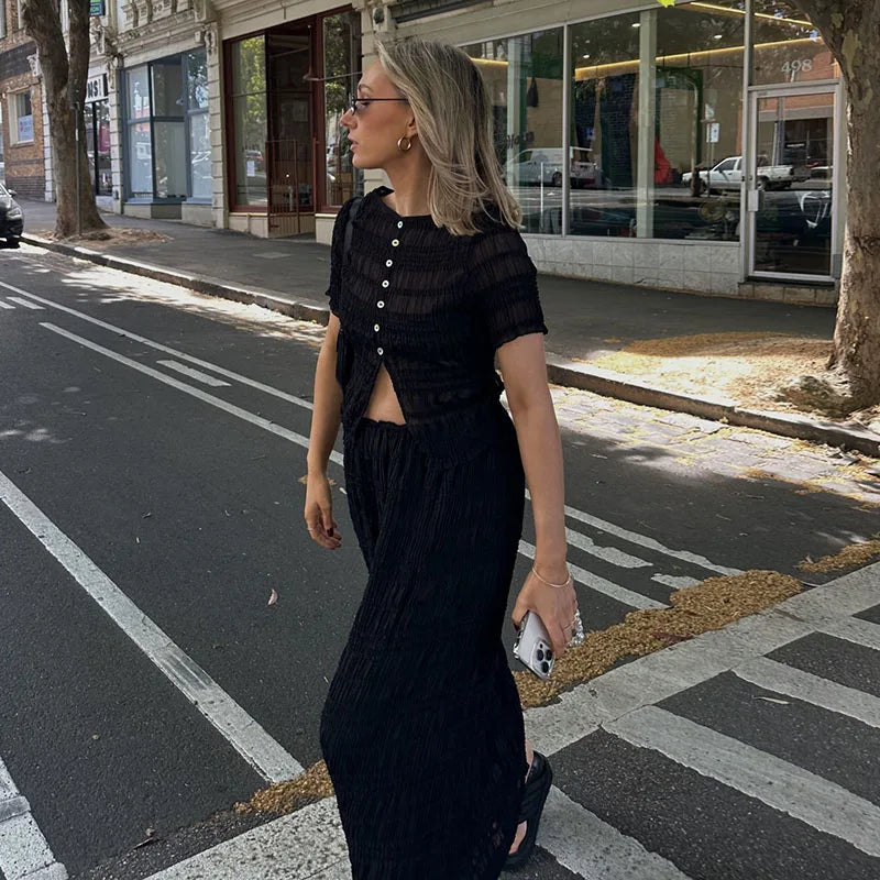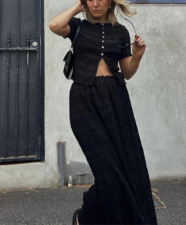 This elegant cotton two-piece set combines breathable comfort with timeless sophistication. Featuring a perfectly matched top and bottom, it offers a polished yet effortless look. Ideal for any occasion, it’s a versatile wardrobe staple crafted from premium cotton.