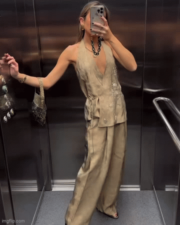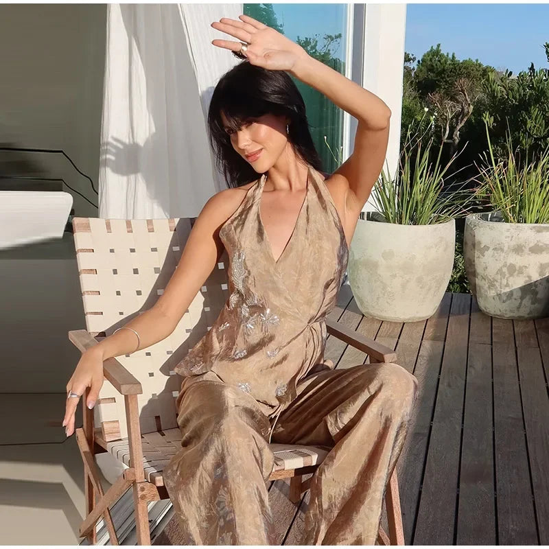 Effortless style meets modern elegance in this set. Featuring a lace-up, backless halterneck tank top paired with flowing wide-leg trousers, this look strikes the perfect balance of chic and sophisticated. Designed for versatility, it’s ideal for nights out, summer parties, or elevated everyday wear. Wear the pieces together for a statement outfit or mix and match with your wardrobe favorites for endless styling possibilities.