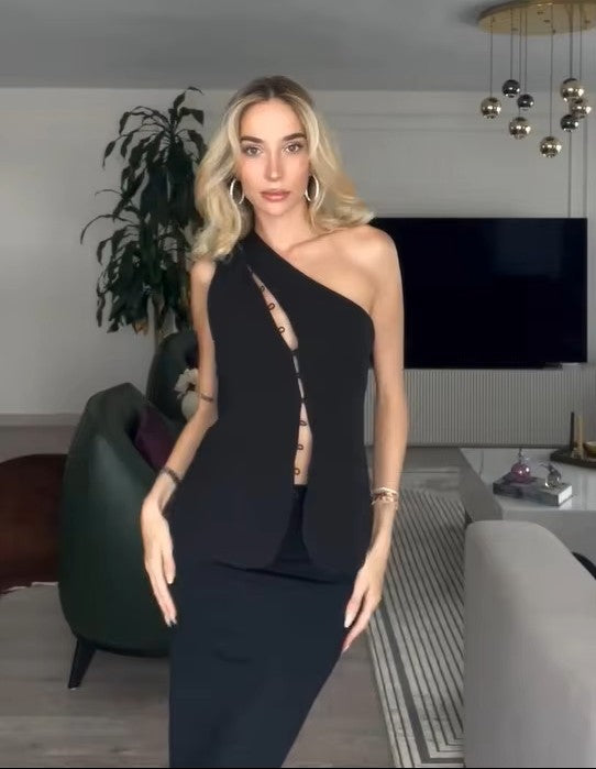 Modern and chic, this vest offers a fresh twist on classic tailoring. With its sleek, asymmetric design and structured fit, it’s perfect for creating a bold yet elegant statement look.