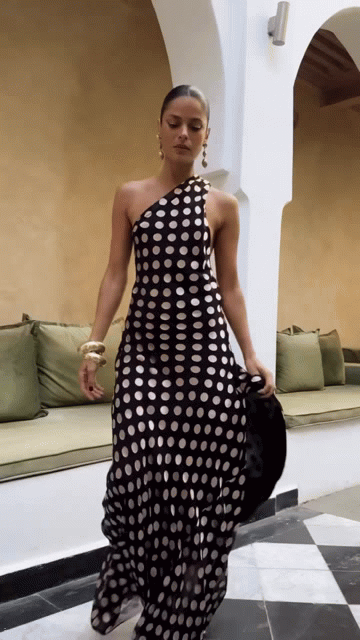 Playful yet elegant, this dress features a chic one-shoulder neckline paired with a timeless polkadot print. Its flattering silhouette adds a touch of modern charm while keeping the look effortlessly feminine. Perfect for garden parties, casual outings, or evening celebrations, this dress brings versatility with a fun twist.