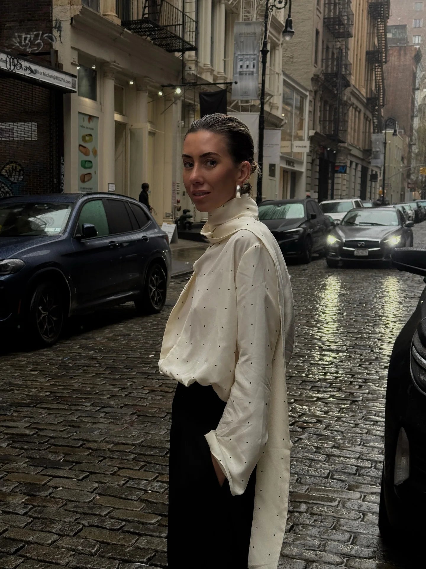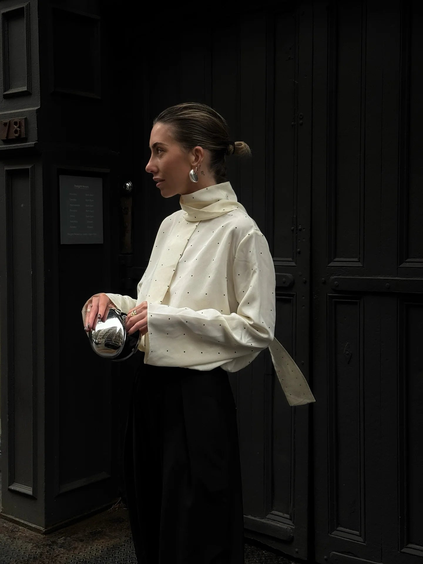 Playful yet refined, this top features a timeless polkadot pattern with a soft, luxurious sheen. Its elegant drape and lightweight feel make it perfect for pairing with skirts or trousers for an effortlessly chic look.