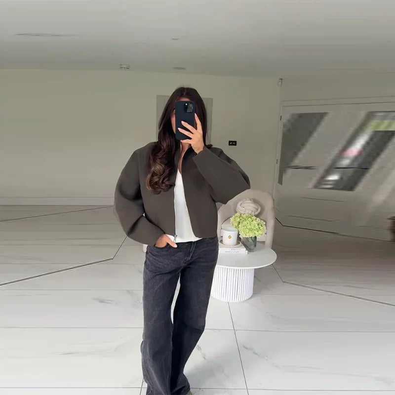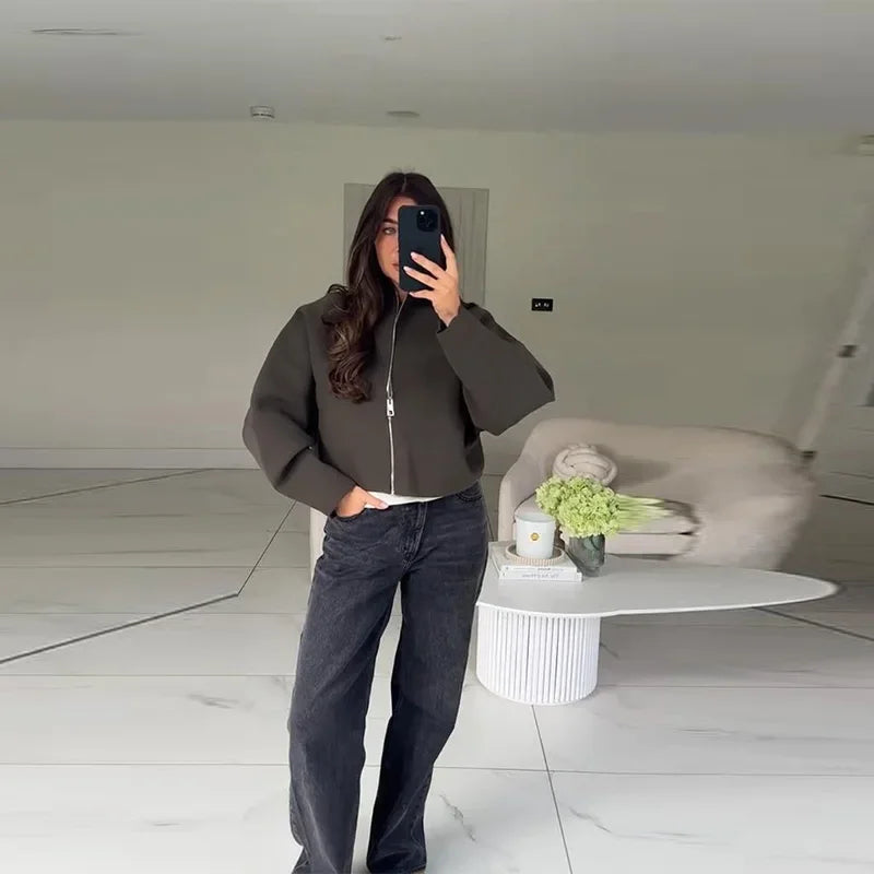 Modern and minimal, this jacket features a structured boxy silhouette with a sleek front zipper for a contemporary edge. Effortlessly cool and easy to style, it’s the perfect layer for a polished yet relaxed look.